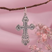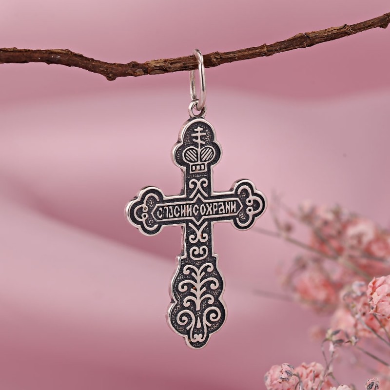 Zilveren borstkruis gemaakt van gezwart 925 sterling zilver! Op de achterkant staat de inscriptie in het Russisch: "Opslaan en bewaren." Krast niet tijdens het dragen.
