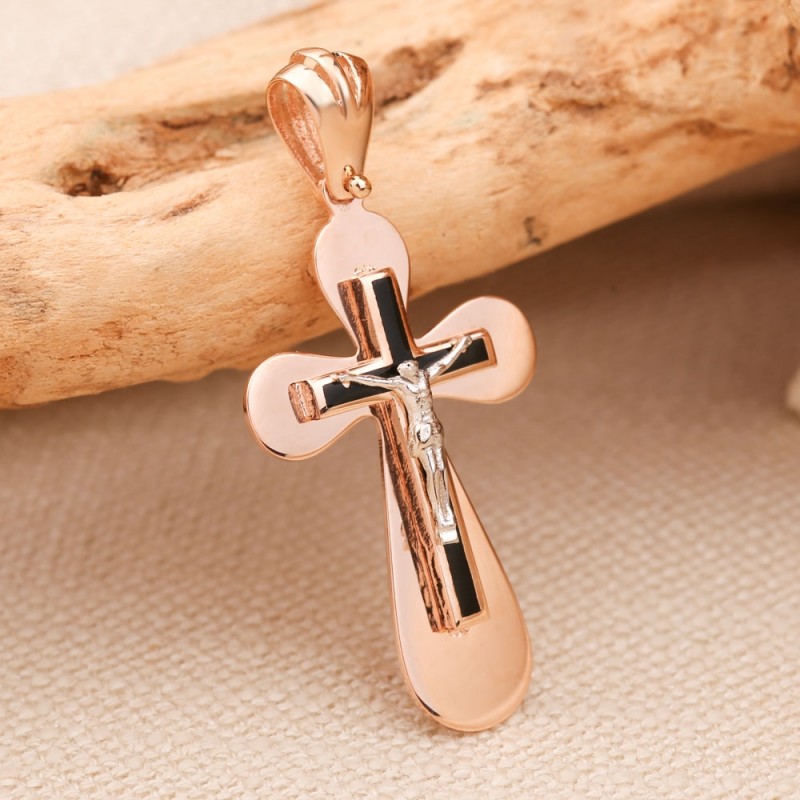 Russisch gouden 585 in Duitsland kruishanger met een kruisbeeld gemaakt van 585 wit/rood goud. Het Christusfiguur is gemaakt van wit goud op een zwarte geëmailleerde achtergrond. Aan de bovenkant van het kruis zit een ring voor een koord of ketting. Krast niet tijdens het dragen.