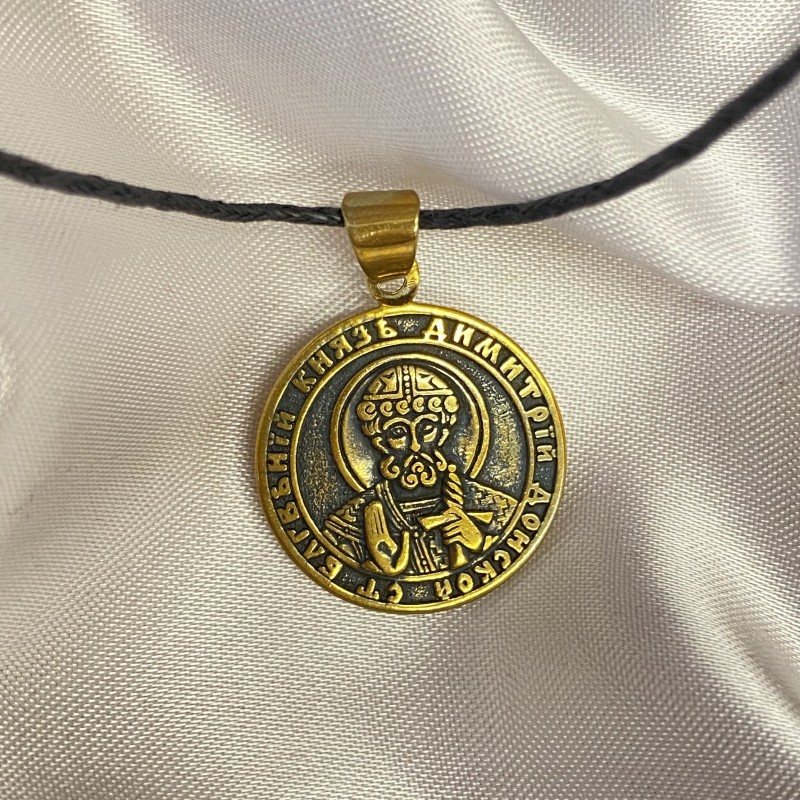 Bronzen hangericoon aan een zwart sterk koord.