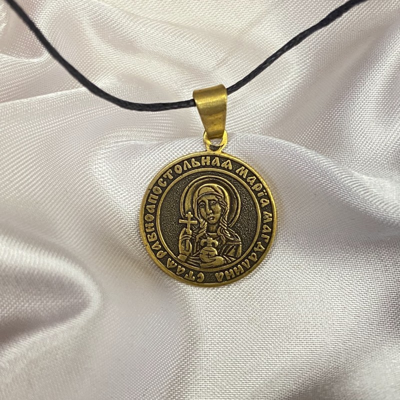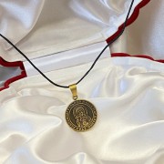 Bronzen hangericoon aan een zwart sterk koord.