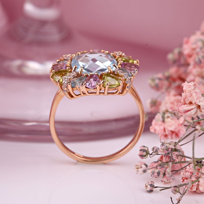 Prachtige ring gemaakt van rood goud 585 monster met topaas, amethist, chrysoliet en sprankelend zirkonia. Speciaal cadeau voor speciale mensen!