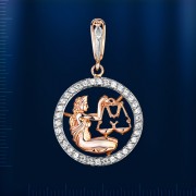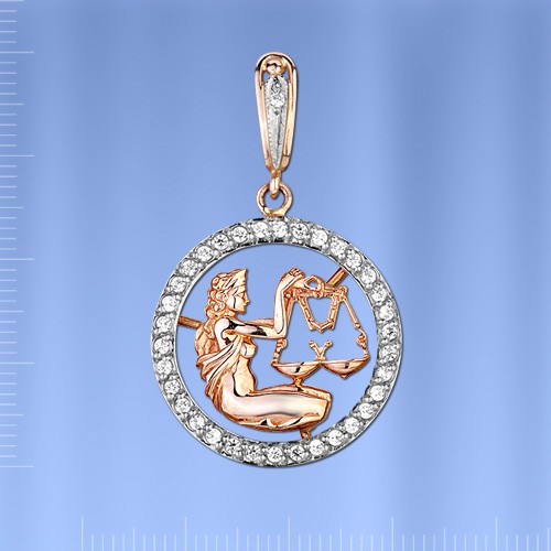 Weegschaal " gemaakt van Russisch goud 585° met 37 fianieten ¢ 1,0 mm. Tweekleurig. Hoogte met oog ca. 40,0 mm. Breedte ca. 24,0 mm