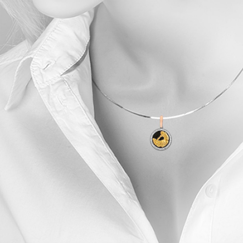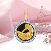 Ronde hanger van 925 zilver met goudlaag en inzetstukken van zirkonia. Aan de bovenkant van de hanger zit een kettingring. Het vergulde patroon ziet er bijzonder expressief uit tegen de achtergrond van zwart email. Verguld met gerhodineerd!