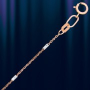 Fijne ketting gemaakt van rood en wit Russisch goud 585º. Het vlechten van ankerkettingen wordt gecombineerd met charmante witgouden cilinders. Dankzij de verwerking met diamantslijpers creëerden de ambachtslieden de mooiste patronen. Het lichtspel en een interessant patroon wekken de indruk dat je naar een product kijkt met inzetstukken van echte diamanten.