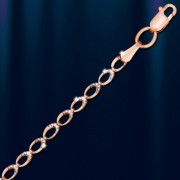 De ovale schakels van warm roségoud zijn gelijkmatig op elkaar geplaatst en vormen een elegante, vloeiende lijn. Elk tweede element heeft een fijne, lichtreflecterende structuur, waardoor een subtiele maar effectieve schittering ontstaat. Het samenspel van gladde en diamantgecoate oppervlakken zorgt voor diepte en dynamiek in het ontwerp.