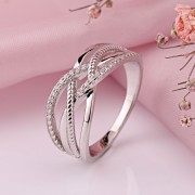 Koop een zilveren damesring 925. Elegante ring van 925 zilver met witte zirkonia overtuigt door zijn stijlvolle design en het harmonieuze samenspel van gebogen lijnen. De elegant ingeweven zilveren banden geven de ring een moderne, driedimensionale vorm en een bijzonder lichte uitstraling.