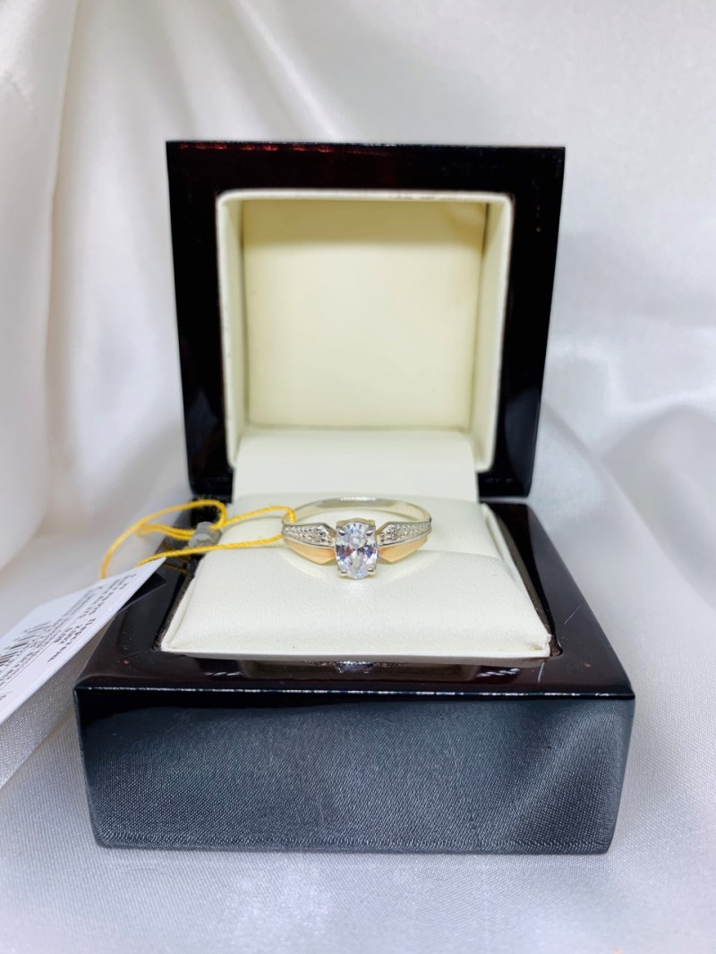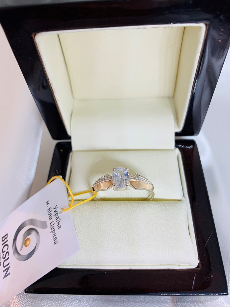 De betoverende ring is gemaakt van 925 sterling zilver en 375 goud, met inzetstukken van fonkelende zirkonia. De combinatie van deze twee edelmetalen, gecombineerd met charmante stenen van verschillende afmetingen, geeft het product een unieke uitstraling en is een lust voor het oog. Zo'n ring zal de tederheid, vrouwelijkheid en charme van de eigenaar benadrukken!
