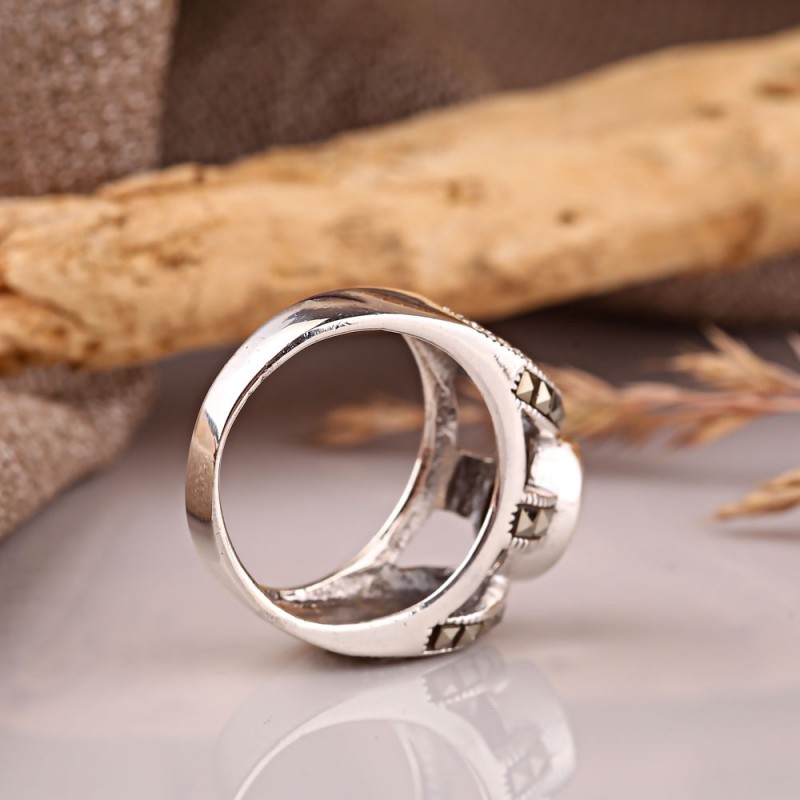 Prachtige ring gemaakt van gezwart 925 sterling zilver met betoverende opaal en diepe markasiet inzetstukken. Zo'n ring benadrukt de verfijning van de smaak en zorgt ervoor dat je je een echte koningin voelt.