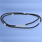 Zwart textielkoord met zilveren uiteinden en cilindrische inzetstukken. Verbindt karabijnhaak met aanhangerslot. Zilver 925. Perfect voor alle zilveren hangers.