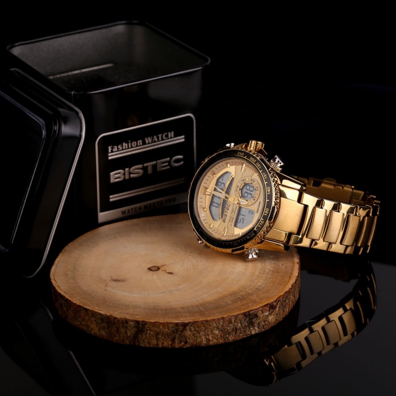 Mechanisch polshorloge “BISTEC” met centrale secondewijzer, kalender, chronograaf, waterdicht (onderdompelingsdiepte tot 30m), met verlichting voor nachtzicht.