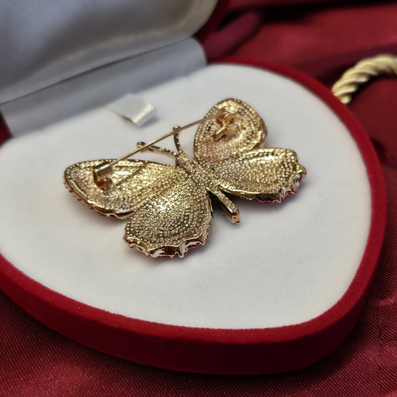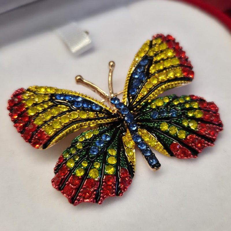 En sjarmerende smykkebrosje i legering utsmykket med glitrende flerfargede cubic zirconia steiner med svertede aksenter. Fargen på steinene er dyktig fremhevet av et flerfarget bakgrunnsbelegg. Brosjer med zirconia understreker ikke bare skjønnheten og ynden til brukeren, men er også et fantastisk tillegg til ethvert antrekk. Denne dekorasjonen har som oppgave å formidle de lyseste og høyeste følelsene til eieren!