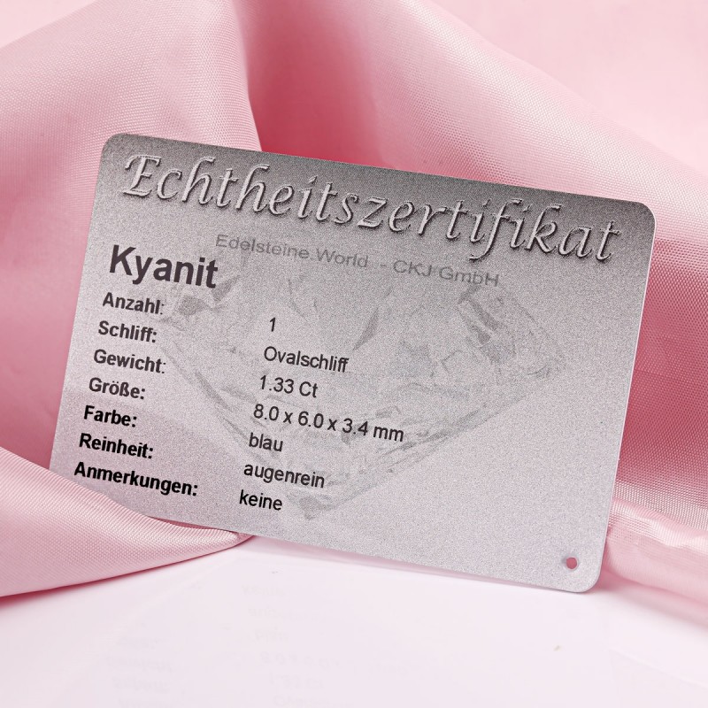 Et spesielt høydepunkt er ekthetsbeviset, som bekrefter egenskapene til kyanitten - inkludert vekt, størrelse, kutt og renhet. Dette garanterer testet kvalitet og gir smykket merverdi.