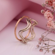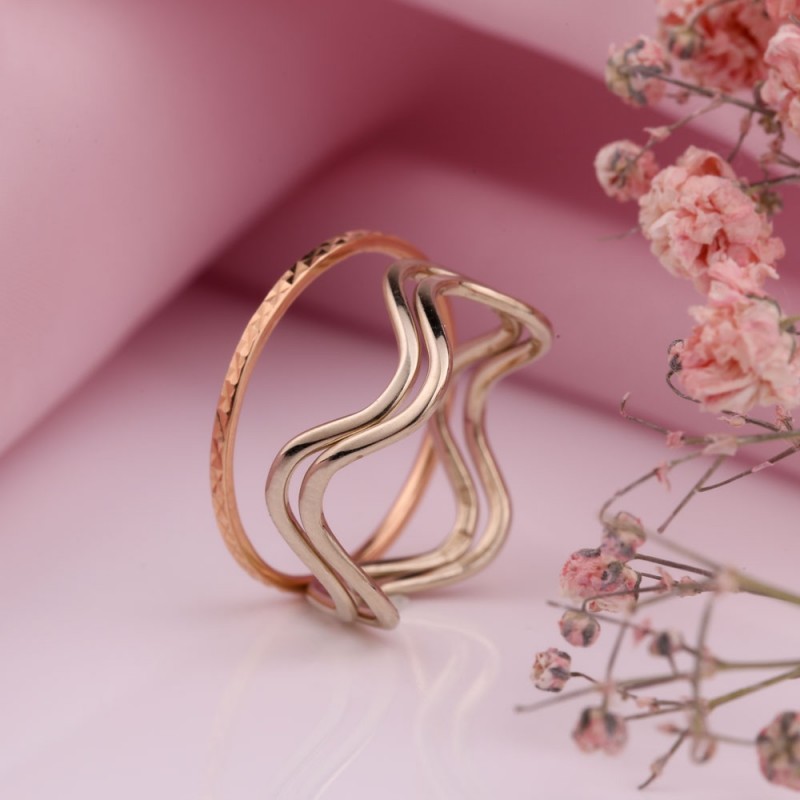 Delikat og romantisk ring laget av rødt og hvitt gull 585°. Ringen består av tre separate ringer, hvorav to er laget av bølgeformet hvitt gull og den tredje er laget av diamantslipt rosa gull. Ringene kan bæres sammen og arrangeres for å lage ditt favorittmønster, eller du kan bære dem individuelt med bare ett av dem. Ved å kjøpe dette produktet kjøper du tre ringer til prisen av én. En fantastisk gave til din kjære som kan fremheve hennes femininitet!