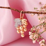 Gull anheng 585 prøve zirkonia. Anheng laget av 585 rødt gull i form av en stilisert drueklase - et symbol på overflod og harmoni. Kombinasjonen av polerte kuler og et bladsett med zirconia skaper en spennende kontrast mellom glans og struktur.