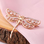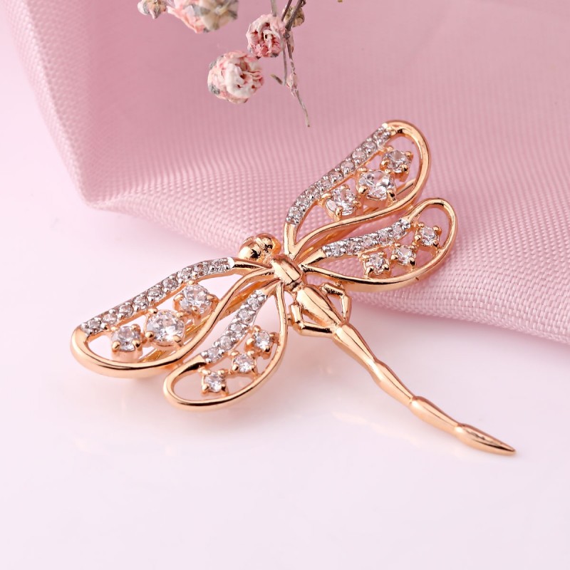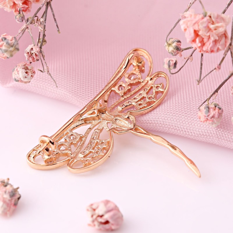 Brosje laget av 585 russisk gull med zirkonia. Rose gull med cubic zirconia på hvitt gull bakgrunn. Gullbrosjer skaper den nødvendige aksenten i bildet og trekker oppmerksomheten til rikdommen og luksusen til tilbehør, fordi gull er vakkert, stilig, elegant og dyrt.