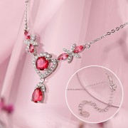 Halskjede laget av sterlingsølv 925 i Tyskland. Romantisk kjede laget av 925 sølv med rubinrøde zirkoner, som imponerer med sin elegante sammensetning av hjerte- og blomsterformer. I midten av designet er en glitrende rubinrød zirkonium, som gir smykket en intens fargeaksent.