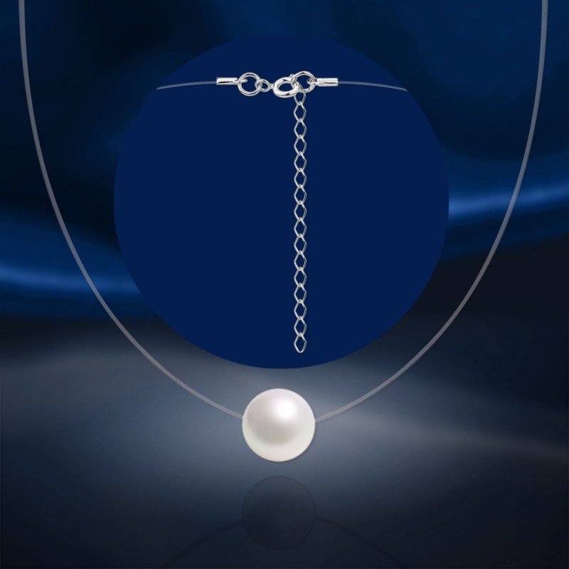 Halskjedet på den usynlige nylonkjeden, med en syntetisk perle som anheng, er laget av 925 sølv. Rhodiumbelagt!