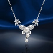 Elegant halskjede laget av 925 sølv med et dekorativt blomsterinnlegg, dekorert med glitrende zirkonium og 3 hvite perler! Rhodium belagt! Ankerveving.