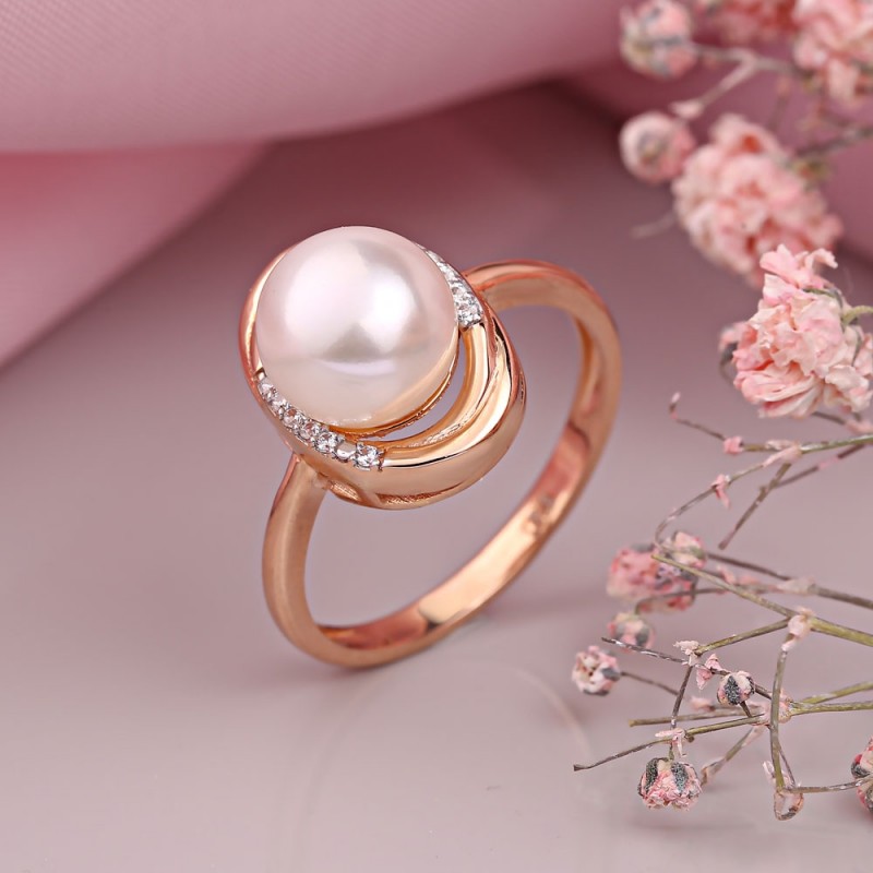 Sjarmerende og delikat ring laget av 585 hvitt og rødt gull, dekorert med sjarmerende og glitrende zirkonia og vakker kulturperle. Legger vekt på femininitet, eleganse og god smak. En sjarmerende gave til dine kjære!