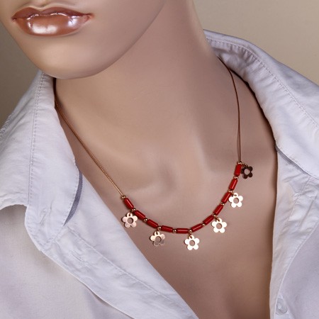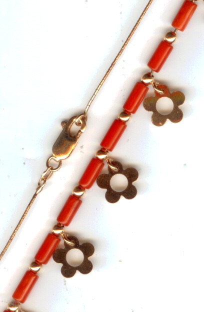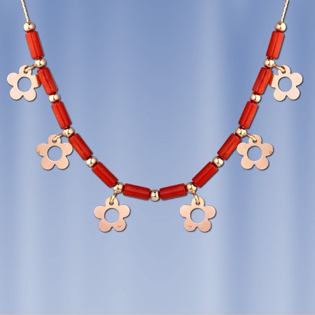 Gullkjede laget av 585° rødt gull med korallinnlegg. Lengde 45 cm