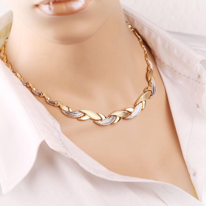 Gold Collier laget av gult gull hvitt gull 585 °. Den grasiøse og omfangsrike gullkollieren laget av 585 hvitt gull og gult gull med glitrende diamantskutt. Innsiden av halskjedet er glatt med en speiloverflate. Collier laget av gull satte den nødvendige aksenten på bildet og vekker oppmerksomhet til rikdommen og luksusen til tilbehøret, fordi gull er vakker, stilig, elegant og dyrt. Passer både en solid dame og en ung kvinne.