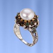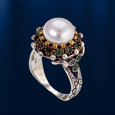 Eksklusiv håndlaget ring laget av svertet sølv 925 dekorert med naturperle Ø 10,0 mm, smaragder Ø 2,0 mm. Bronse