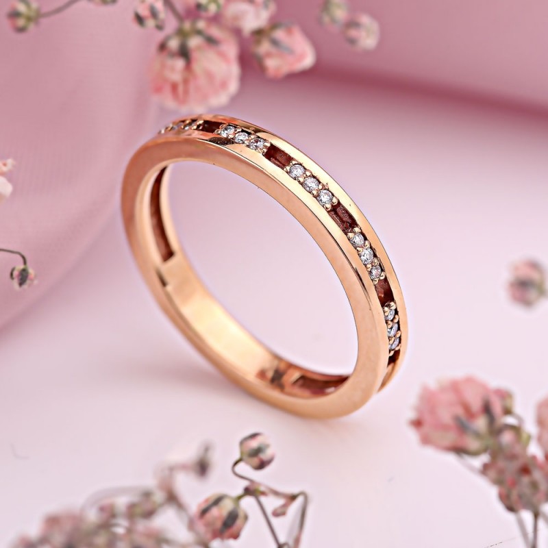 Elegancki pierścionek wykonany z czerwonego złota próby 585 z brylantami. Piękny prezent dla bliskiej Ci osoby!