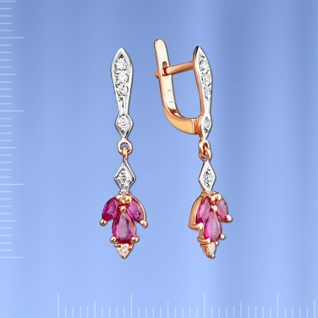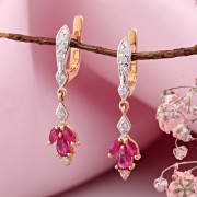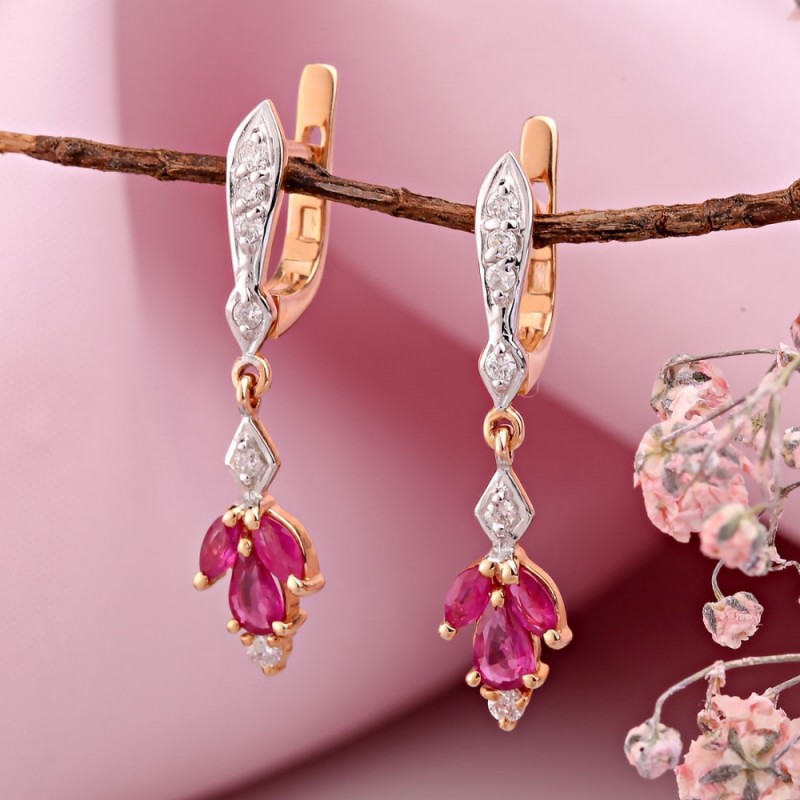 Złote kolczyki z diamentami i rubinami. Eleganckie złote kolczyki wykonane z czerwonego złota próby 585 z akcentami z białego złota, które w szczególny sposób podkreślają piękno diamentów i rubinów!