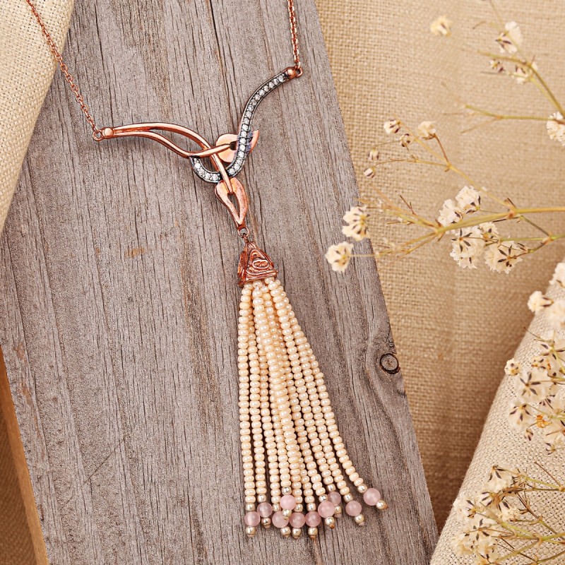 Ten wspaniały naszyjnik wykonany z 925 srebrnego srebra, wykonany w stylu orientalnym, ucieleśnia elegancję, luksusowy i drobny orientalny szyk. Centralne elementy biżuterii - różowy kwarc i uprawiana perła - tworzą harmonijny kontrast i podkreślają łaskę i żeńską charyzmę.
