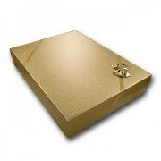 Pudełko kartonowe na pierścionki, kolczyki i coli. Wierzch pokryty jest strukturalnym papierem w kolorze złota, a do wieczka przymocowana jest kokardka. Wewnętrzna część jest w kolorze białym, z uchwytem na pierścionki, kolczyki i naszyjnik.