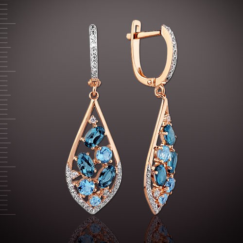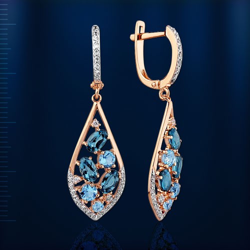 Kolczyki wykonane z czerwonego/białego złota 585° ozdobione 2 topazami ¢ 2,25 mm 0,14 ct, 4 topazami ¢ 3,5 mm 0,6 ct, 6 topazami London ¢ 5,0 x 3,0 mm 1,2 ct, 50 narzeczonymi ¢ 1,0 mm, 4 narzeczonymi ¢ 1,25 mm, 2 narzeczonych ¢ 1,5mm