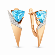 Złote kolczyki z topazami i cyrkoniami. Kolczyki wykonane z czerwonego złota próby 585 łączą wyraźną geometrię z intensywnymi efektami kolorystycznymi. Precyzyjny, zwężający się kształt nadaje projektowi nowoczesny, architektoniczny wygląd.