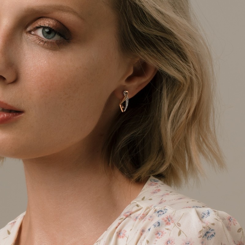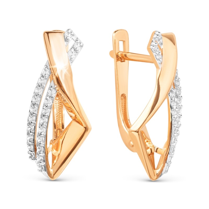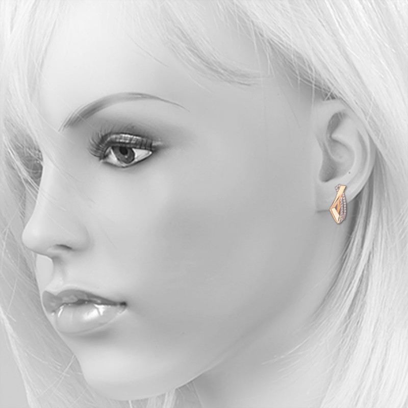 Kolczyki z rosyjskiego złota próby 585. Te kolczyki wykonane z czerwonego złota próby 585 łączą płynne linie z błyszczącymi elementami cyrkonii, tworząc nowoczesny, elegancki design. Zakrzywiony kształt nadaje dynamiczny wygląd, a rzędy cyrkonii odbijają światło w ukierunkowany sposób.