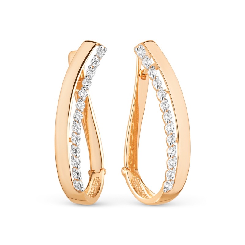 Kolczyki Rosyjskie złoto próby 585. Te eleganckie kolczyki wykonane z czerwonego złota próby 585 charakteryzują się smukłym kształtem i ciągłym rzędem cyrkonii. Precyzyjnie osadzone kamienie zapewniają równomierny, świetlisty blask i podkreślają wyraźne linie.