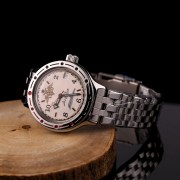 Mechaniczny zegarek na rękę „Amfibia” z naciągiem automatycznym, z centralną sekundą i kalendarzem natychmiastowym, odporny na wstrząsy, wodoodporny (głębokość zanurzenia do 200 m).