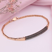 Złota bransoletka z czerwonego złota próby 585. Kobieca bransoletka wykonana z czerwonego złota próby 585 z czarnymi diamentami na poczerniałym tle. Wzór ten podkreśla głębię koloru kamieni. Fantazyjne tkanie z lustrzaną powierzchnią. Ta złota bransoletka z brylantami doskonale ozdobi dłonie pełnych wdzięku kobiet! Wspaniały prezent w kolorze różowego złota dla ukochanej osoby!