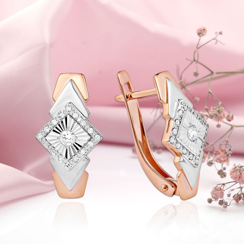 Elegantes brincos de ouro feitos de ouro vermelho/branco 585 com diamantes. O ouro branco realça a beleza dos diamantes de uma forma especial! Corte de diamante!