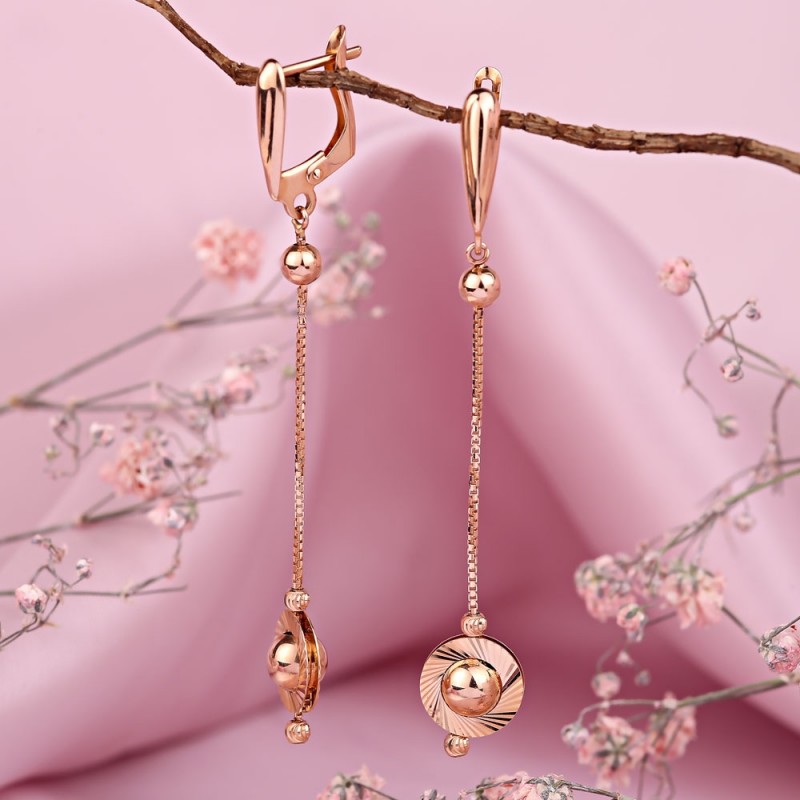 Lindos brincos de ouro feitos de ouro vermelho 585. A corrente de âncora e o pingente disco móvel garantem que os brincos tenham uma aparência variável. Corte de diamante!