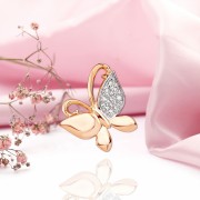 Pingente de ouro com diamantes. Este delicado pingente de borboleta foi criado para mulheres que reconhecem a beleza nos movimentos mais suaves. As linhas quentes do ouro vermelho lembram uma leve asa batendo, enquanto uma das asas brilha com um pavé de diamantes cintilantes - como o orvalho da manhã na primeira luz do dia.