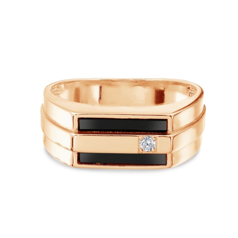 Anel masculino em ouro russo 585 em zircônia alemã. Anel masculino elegante feito de ouro vermelho 585 com uma inserção feita de zircônia branca e preta brilhante.