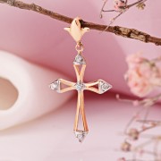 Pingente de Cross Cross Russian Gold 585 com diamantes - pingente cruzado feito de 585 ouro vermelho com inserção de diamantes e detalhes em ouro branco. A cruz não arranha enquanto usa