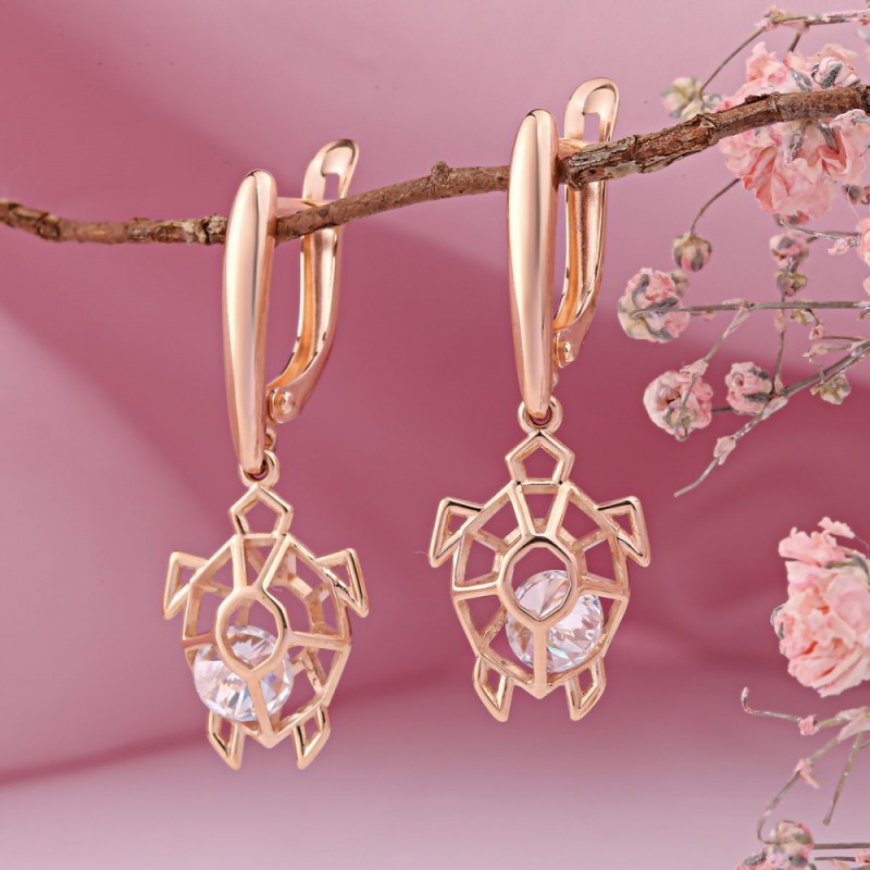 Brincos de ouro feitos de ouro vermelho 585 com zircônia na Alemanha. Brincos femininos e elegantes feitos em ouro vermelho 585, decorados com zircônias brilhantes. Irá destacar sua elegância e feminilidade e atrair olhares de admiração.