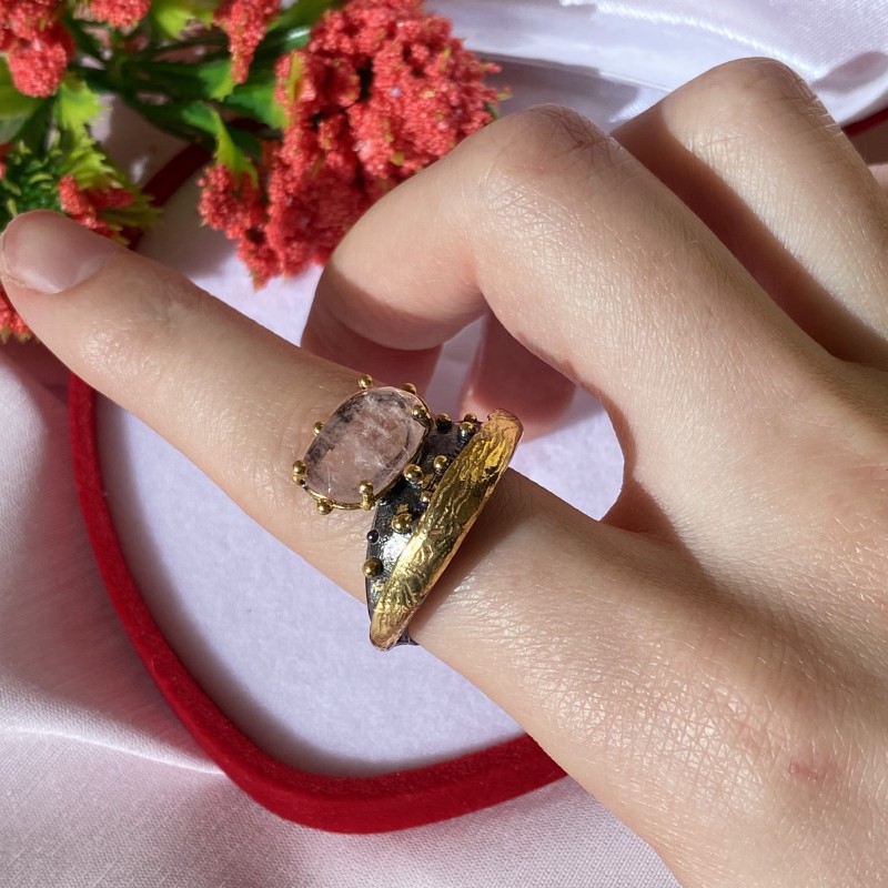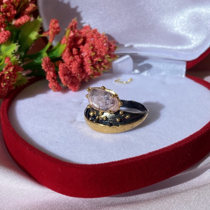 Um charmoso anel feito de prata 925 enegrecida com banho de ouro amarelo maciço, decorado com lindo quartzo rosa. Graças aos detalhes habilmente colocados usando banho de ouro, o anel tem uma beleza única. Um excelente complemento para a sua imagem de feminilidade e romance.