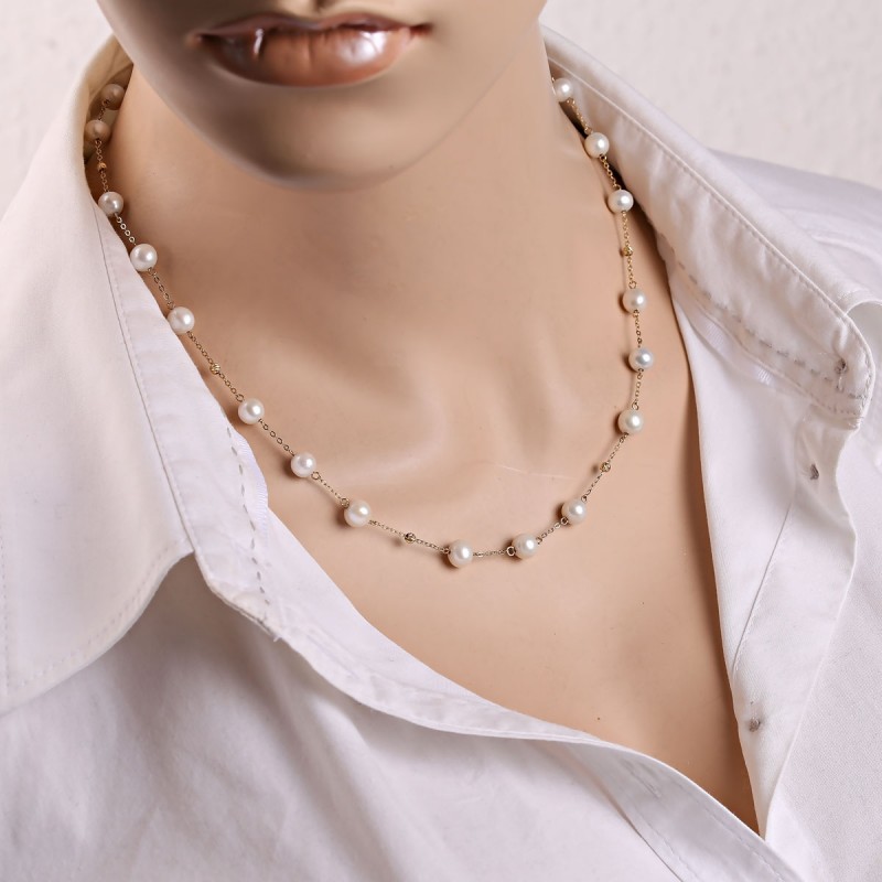 Colar de ouro ouro amarelo ouro russo 585 contas. Elegante colar de ouro feito de ouro amarelo 585 com inserções de encantadoras pérolas cultivadas, em uma corrente de âncora com corte de diamante feita de ouro amarelo 585, decorado com bolas de ouro com corte de diamante.