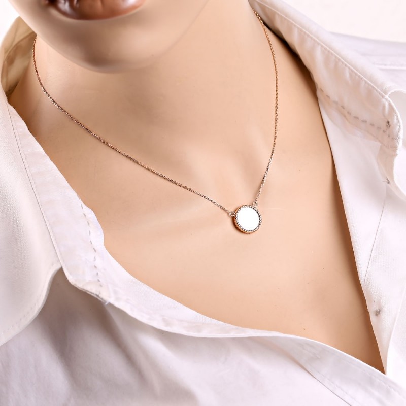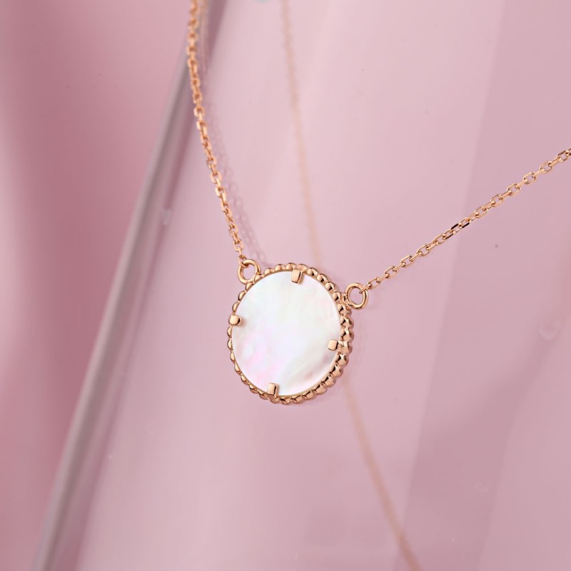 Colar de ouro Ouro russo 585 em madrepérola alemã. Colar de ouro delicado e romântico feito de ouro vermelho 14 quilates, decorado com madrepérola iridescente. Corrente - trança âncora com corte de diamante. Se você deseja enfatizar em sua companheira sua feminilidade, graça, sorriso e beleza, então esse presente é ideal para você.