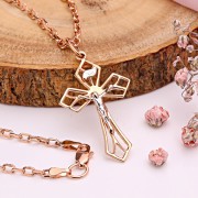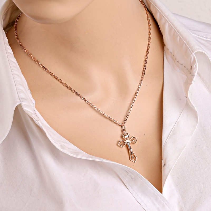 Pendente cruz com corrente em ouro 585. A cruz ornamentada é feita em ouro vermelho 585 e tem corpo em ouro branco 585. No verso há a marca da finura, que confirma a autenticidade do ouro.