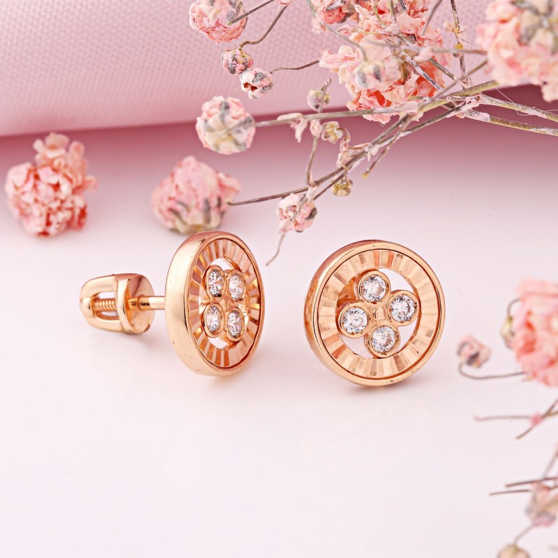 Compre brincos de ouro rosa com zircônia 585. Brincos feitos de ouro vermelho 585 com elemento decorativo redondo e zircônia - uma joia elegante com brilho expressivo e linguagem de design clara. O arranjo central de oito zircônias redondas forma um padrão semelhante a uma flor e garante um brilho fino e uniforme.