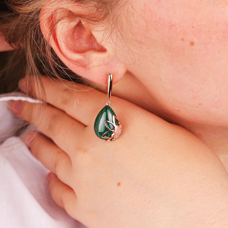 Brincos dourados pendurados. Lindos brincos feitos de prata esterlina de 925 vermelho, decorados com uma malaquita encantadora e zirconia espumante. Esses brincos elegantes oferecem uma oportunidade única de enfatizar sua individualidade e transmitir uma imagem de feminilidade, sol e ternura.