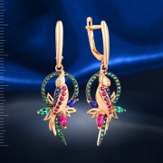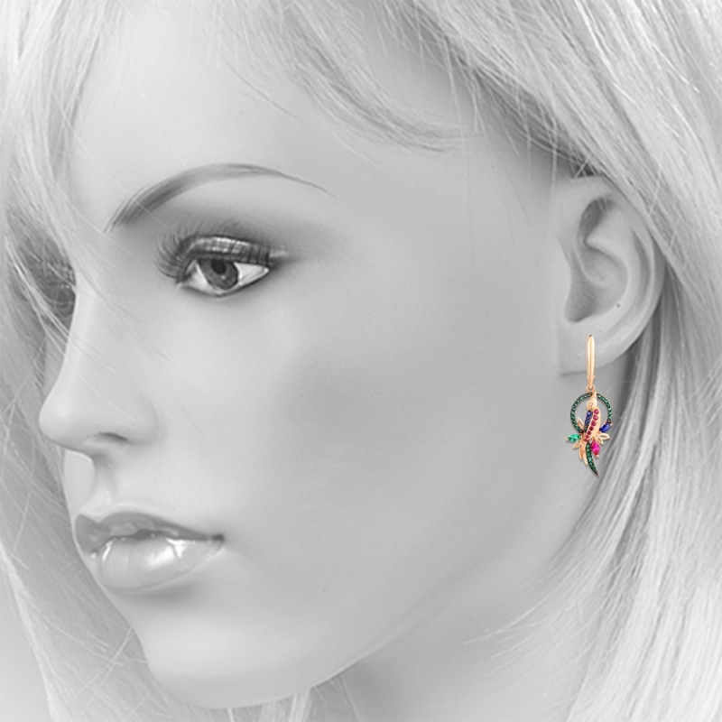 Cercei grațioși, feminini, din aur roșu de 14 carate, cu inserții de smaralde, safire și rubine fermecătoare! Safirele strălucesc într-un mod special pe fundalul aurului înnegrit. Combinația magnifică de aur și frumusețea nepământeană a acestor pietre poate cuceri pe oricine. Subliniază rafinamentul gustului tău, tandrețea și feminitatea imaginii și oferă o stare de spirit grozavă!