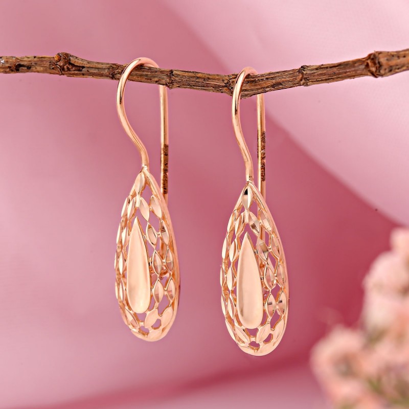 Cercei din aur rusesc 585. Acești cercei arată ca o dantelă fină aurie - aeriși, ușori și plini de lumină. Structura în filigran, ajurata, amintește de modelul delicat, în timp ce elementul neted în formă de lacrimă din interior dă un accent elegant și reflectorizant.